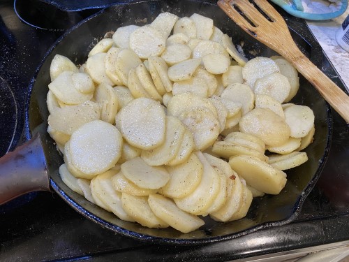 - 4 medium russet potatoes, peeled and sliced into 1/4″ slices
