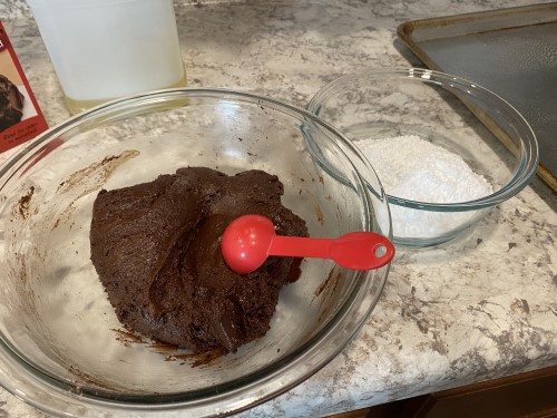 4. Drop tablespoon sized ball of dough into the powdered sugar and roll around until fully covered. You want to almost over do the powdered sugar, as the dough will absorb some of the sugar.