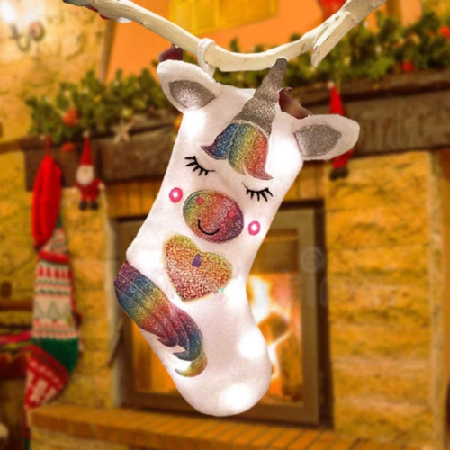 - It has a smiley face and heart pattern unicorn design. The best feature of this Christmas stocking is its built-in LED lights, which requires 2 AA batteries (not included). It also has sturdy hanging loops to ensure that you can hang it safely and easily.
