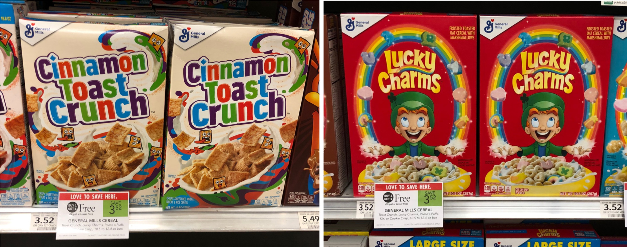 General Mills Cheerios Cereal, 8.9 to 10.8 oz, or Toast Crunch, Lucky Charms, Reese’s Puffs, Cocoa Puffs, Cookie Crisp, Kix, or Trix, 9.7 to 12.4 oz, BOGO $3.52 – $4.29