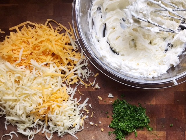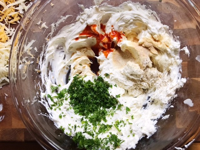 2. Add in the chives, parsley, Worcestershire, hot sauce, garlic powder, onion powder, and salt and pepper. Mix on low until well combined.