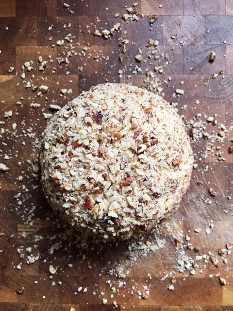 5. Remove the ball from the plastic wrap. Spread the pecans on a plate and roll the cheese ball until fully coated.