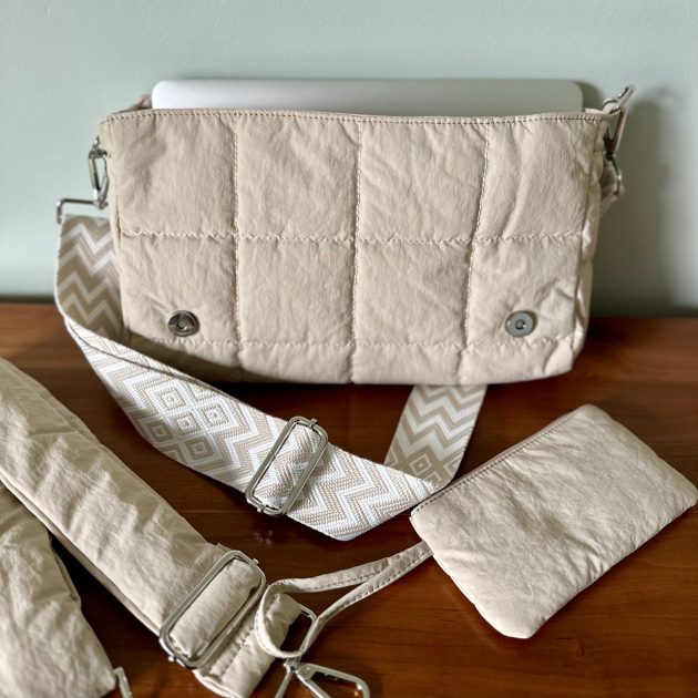 Sarah here — Cluci sent me this puffer shoulder bag to try and I LOVE it. It comes with two straps: a shorter puffer strap and a woven strap. Both straps work as a crossbody or a shoulder bag.