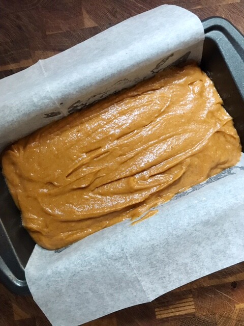 - Preheat your oven to 350 degrees. Grease a loaf pan and line with parchment paper (allowing some overhang on the long sides).