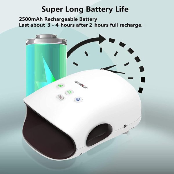 - Rechargeable and Portable-The CINCOM hand massager with built-in 2500mAh lithium battery can last 3-4 hours after full charging, so you can perform a hand massage anytime and anywhere. You can also use it while charging. It automatically stops to save power after 15 minutes. It is lightweight and portable to carry with a storage bag.
