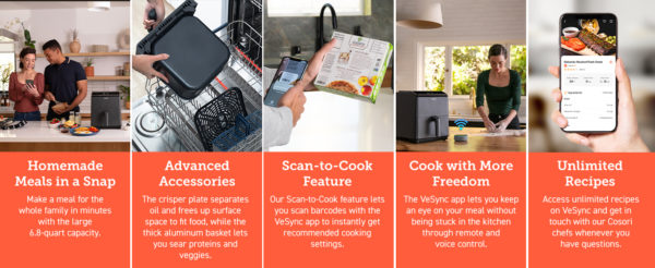 - The free VeSync app lets you control your air fryer remotely, monitor cooking progress, and activate voice control with Amazon Alexa and Google Assistant for effortless cooking