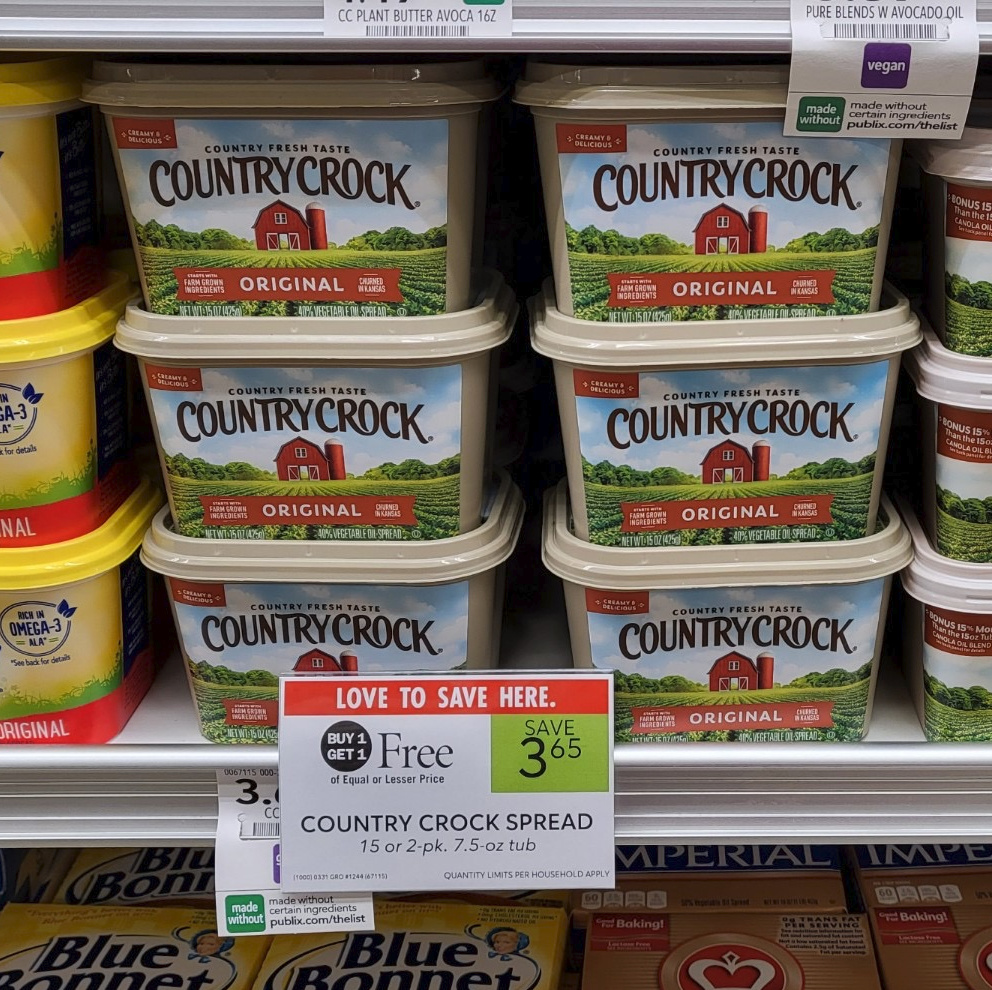 –$0.50/1 Country Crock Original Buttery Spread product (Original, Light, Churn, Calcium or Baking Sticks). Excludes Country Crock Plant Butter and Plant Cream Publix Digital Coupon