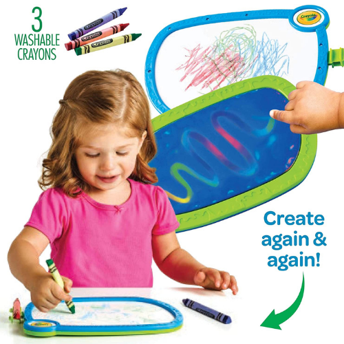 - DOUBLE DOODLE BOARD: Features 1 Double Sided Doodle Board and 3 Washable Crayola Crayons for mess free, creative fun!