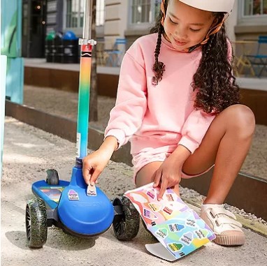 Kids can decorate their scooter with sticker packs featuring all their favorite Crayola colors, plus it includes a cute carry case for kids to store their crayons, chalk or anything else they want to take along with them on their new ride!  It’s also foldable for easy storing.