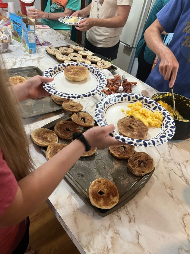 - Cinnamon Sugar Bagels, Bacon, Scrambled Eggs, Orange Juice