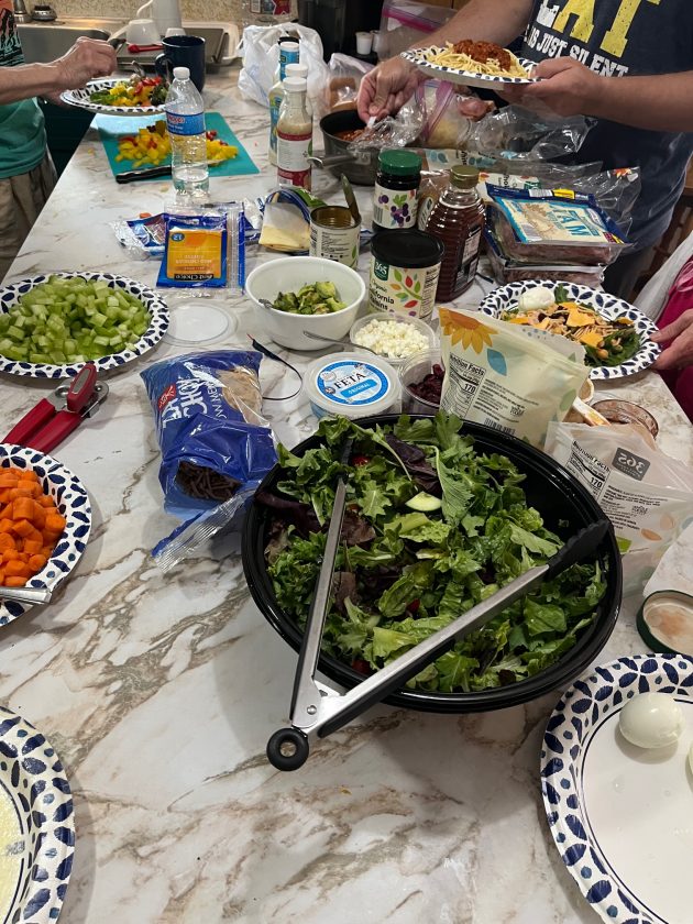 For lunch, we had a huge Build-Your-Own Salad Bar (most all of my family loves salads!). We also had bread and meat/cheese and peanut butter/jelly/honey for sandwiches for the kids and any adults who didn’t just want a salad. In addition, we set out any leftovers from breakfast or dinner.