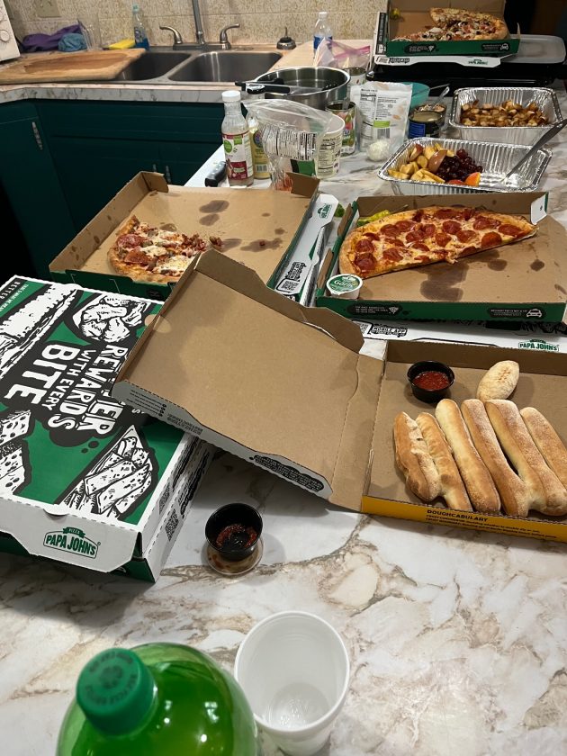 - Papa John’s Pizza, Breadsticks + leftover salad and fruit