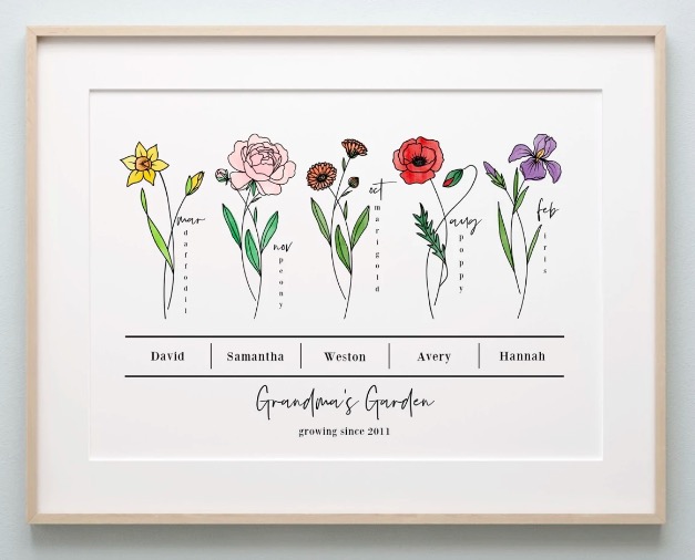 Customize it with up to 7 names/flowers, a specific phrase of your choice. Available in three different print sizes.