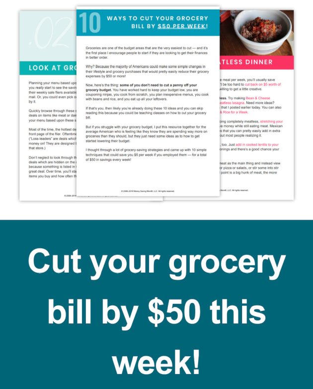 Need some more ideas? Sign up for my FREE cheatsheet with 10 Ways to Cut Your Grocery Bill by $50 This Week.