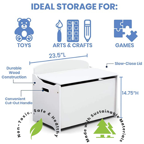 - SAFETY FEATURES: Slow closing lid with safety hinge prevents the toy box from closing too quickly