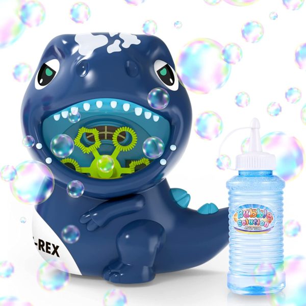 - You only need to pour bubble liquid into the mouth of the dinosaur, turn on the switch, and let the bubble wand spin up. Then you will see a lot of cute bubbles are constantly pouring out of its mouth! The bubble machine needs to be loaded with 3 AA batteries to work. When the dinosaur blows bubbles, it will hum bubble blowing sound and music.