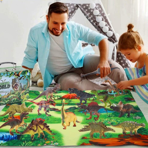- Packing List: An exquisite metal box about 11 X 7 X 4 inches, a non-woven fabric activity playmat about 31.2 X 27.3 inches, 14 large 7 inches dinosaur figures, and 20 free dinosaur knowledge and fighting index cards.