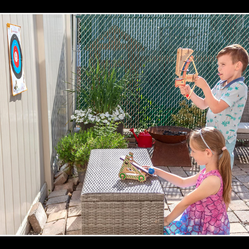 - Arrowball Crossbows vs Catapult slingshots: Using this 20 pieces STEM kit, you can create 2 separate models such as Catapult shooter and wooden crossbow. By using these wood model kit, you can play in several ways – Create 2 different teams that aim at your opposite target and strike the ball to win the battle. You can also practice shooting by aiming to target.