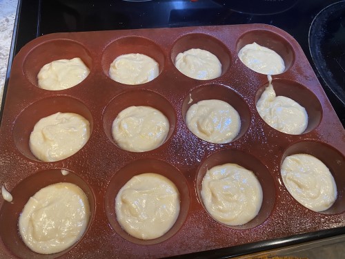 Spray a muffin tin and fill each hole about 1/3 cup up with batter.