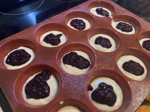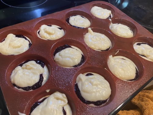 - Spray a muffin tin with cooking spray and fill each hole about 1/3 way full with batter.