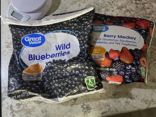 I used part of a bag of mixed berries and part of a bag of wild blueberries. It was about 4 cups total.
