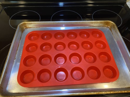 Grease the muffin tin with cooking spray. I place mine on a baking sheet because its silicone and needs a solid foundation.