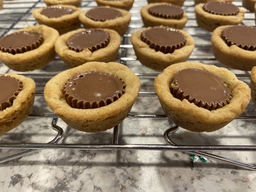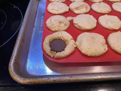 - As soon as the cookies come out of the oven, gently place a peanut butter up into each muffin cup.