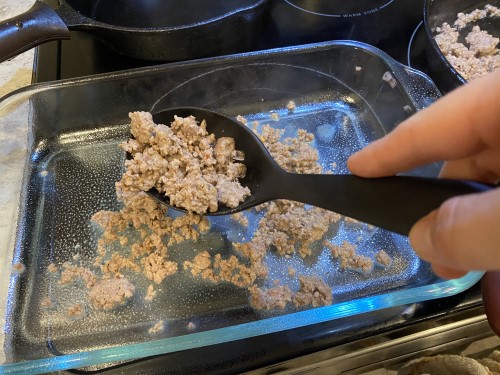 To save time, I just use a slotted spoon to put the sausage in a greased baking dish. A little bit of grease will keep it from sticking too badly, anyway.