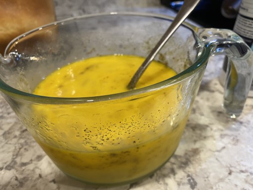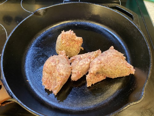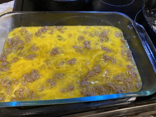 While the sausage is cooking, whisk together all 12 eggs and add your seasonings. If you’re feeling really decadent, you can put in a few splashes of cream or milk as you whisk the eggs, but that’s not even necessary.