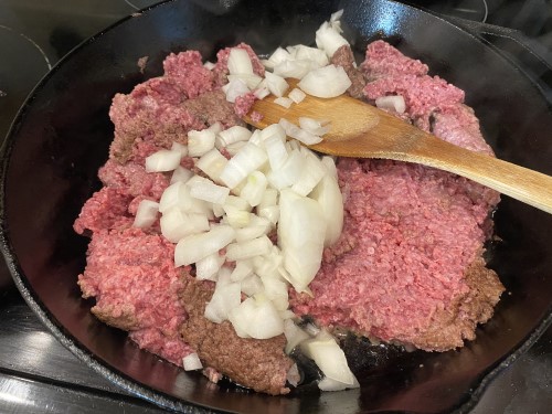 - Cook the ground beef and onion in a skillet on medium heat until the beef is browned. Drain the grease.