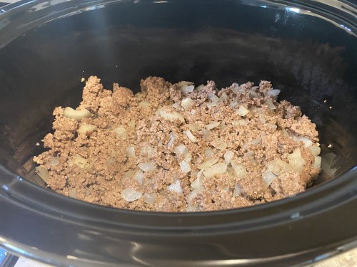 To start, you’ll need to cook the ground beef and onion together and drain all the grease.