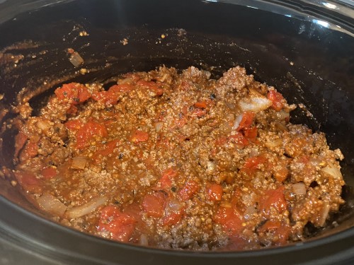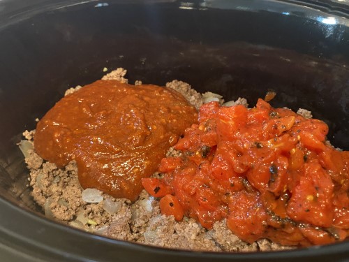 - Add the sauce and the diced tomatoes to the beef in the slow cooker.