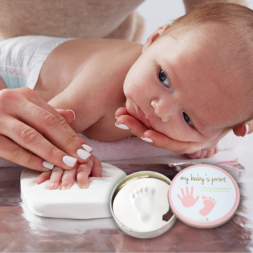 - This handprint mold kit includes everything you need to create adorable impressions of a baby’s handprint or baby’s footprint. You’ll receive no-mess impression clay, a rolling pin, and a shaping ring, along with a charming baby keepsake tin for storage.