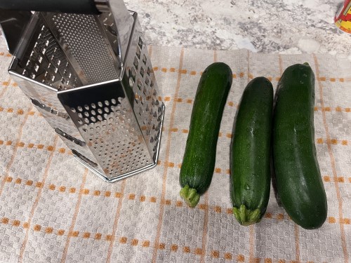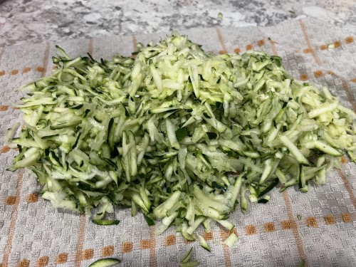 The first step is to shred the zucchini. I use an old-fashioned grater and do it directly on a clean dish towel.