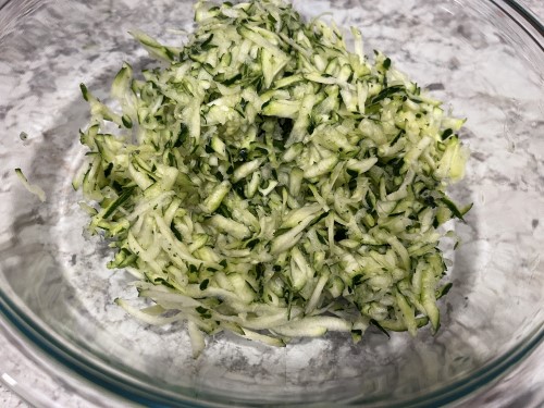 - Shred the zucchini and use a clean dish towel to remove all the water.