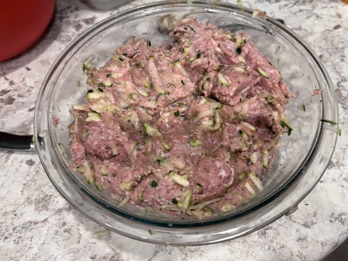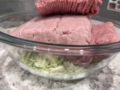 - Add the zucchini and ground turkey together and use your hands to mix them together.