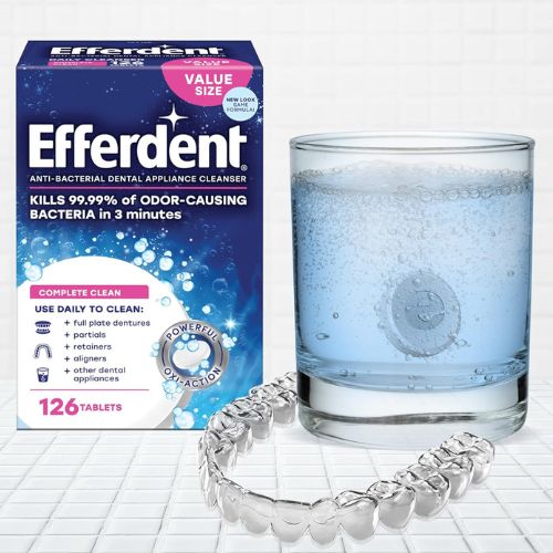 - Use Efferdent retainer cleaner tablets daily to clean retainers, full-plate dentures, partials, aligners and other dental appliances