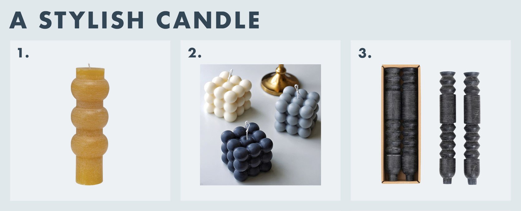 - Unscented Totem Pillar Candle | 2. Bubble Cube Shaped Candle | 3. Unscented Totem Taper Candles (Set of 2)