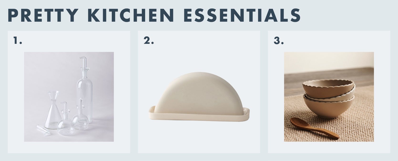 - Simple Oil & Vinegar Cruets | 2. Porcelain Butter Dish | 3. Scallop Edge Pinch Bowls (Set of 3)