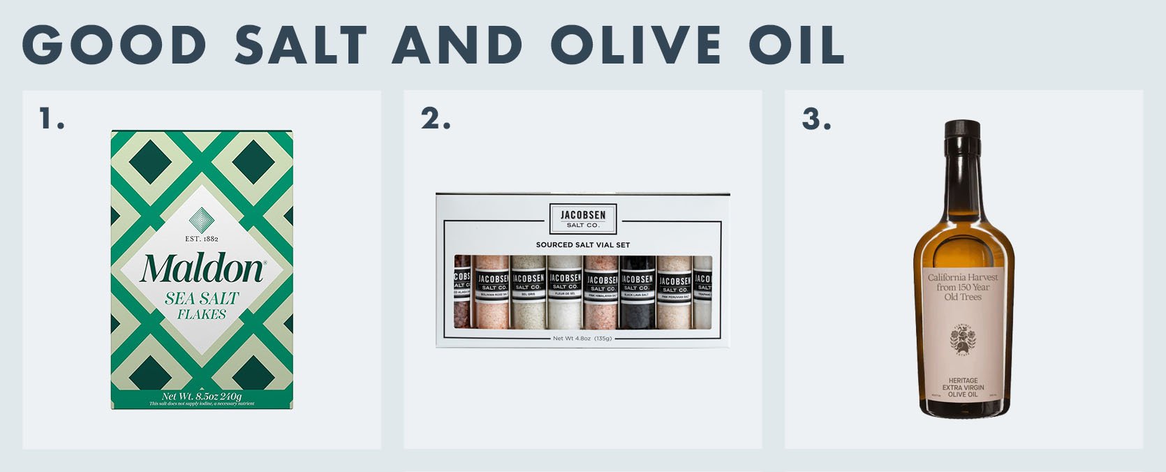 - Maldon Salt | 2. Jacobsen Salt Co. Salt Sourced 8 Vial Set | 3. Flamingo Estate Heritage Extra Virgin Olive Oil