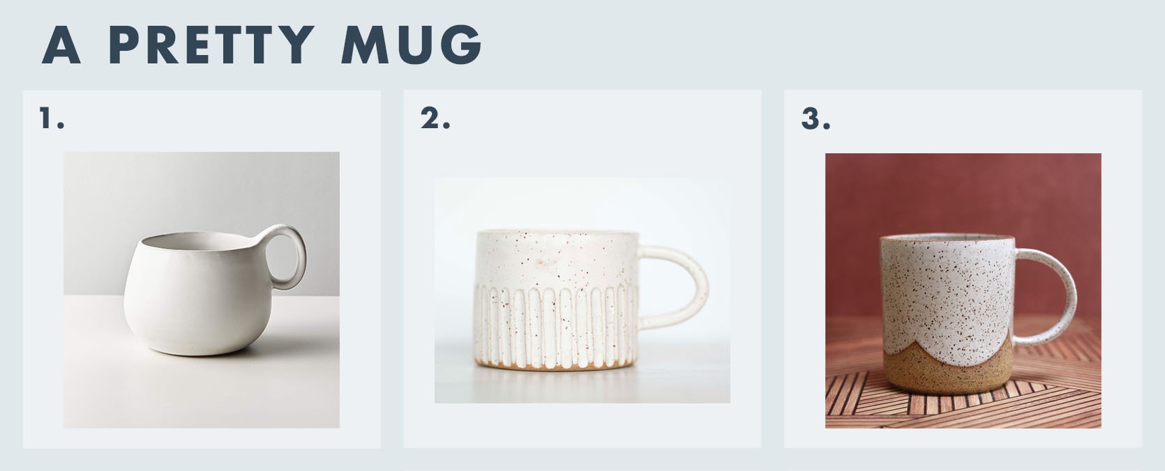 While I have, and use these Target mugs for years every day, giving just one feels like an odd gift because it’s not super special. But these three all feel gift-worthy (homemade or design-forward) and I searched for a long time on Etsy to find them. Also no offense, but don’t give me a low wide mug – I like my coffee to stay HOT.