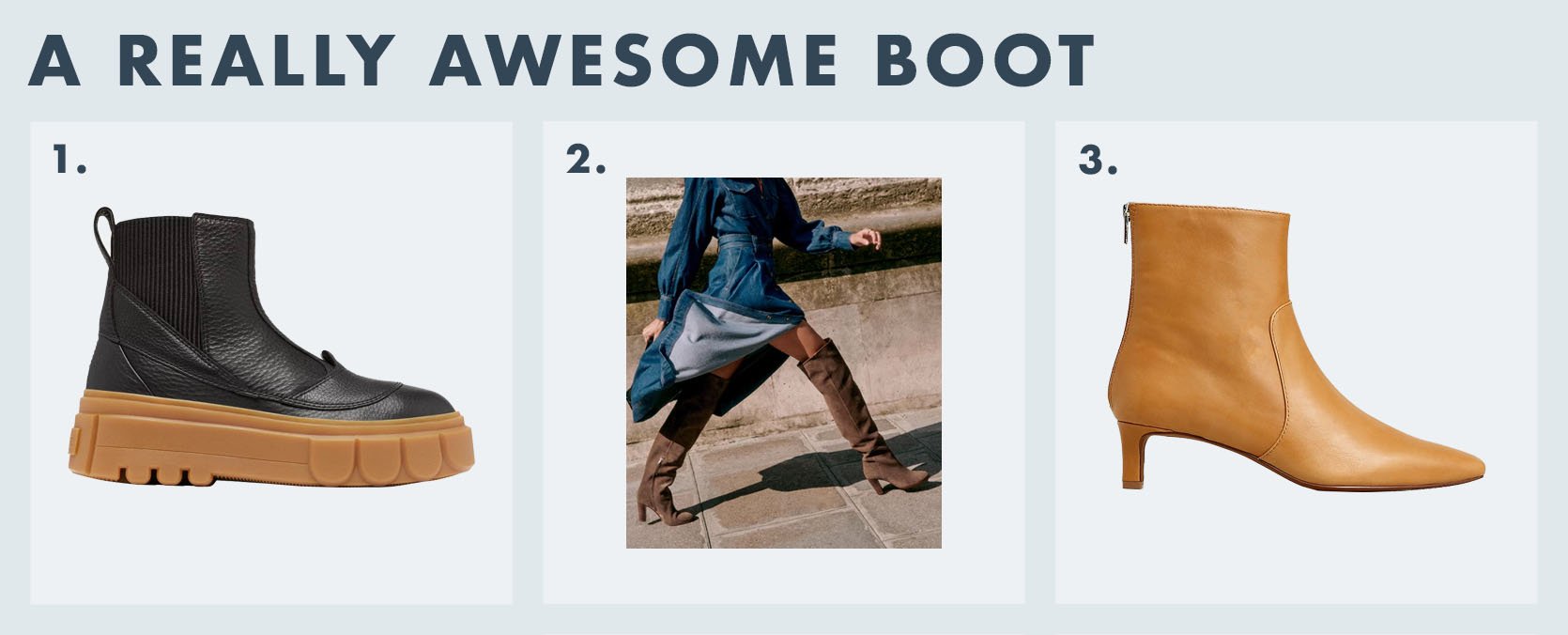 I chose these three for very different reasons/functions/occasions. #1 is super stylish and yet totally waterproof (specifically great for wetter climates). I wear these every wet day when I still want to look cool. #2 is so beautiful – far over the knee which is the current “boot du jour,” but I think these will be “in” for decades. I feel very sexy and pretty in these (and they come in blue which I kinda regret not getting). #3 I have found myself wearing so frequently because they go with every length and width of pant (skinny, wide, boy, flare – all of them) and give a lift without being uncomfortable heels. They are also elongating and flattering.
