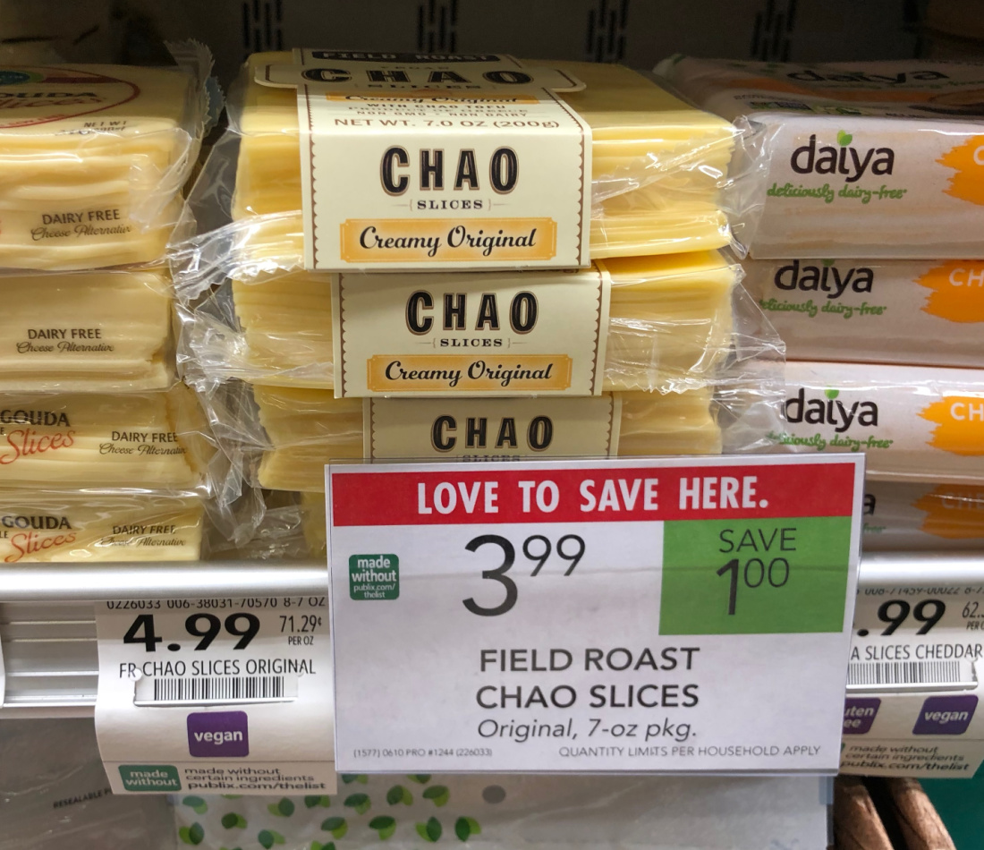Grab a super discount on Field Roast Chao Slices at Publix. With the sale, coupon and cash back offer you pay just $1.74… way better than the original price of $4.99!
