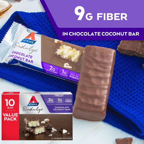 - CHOCOLATE COCONUT BAR. Let this rich and decadent Atkins Endulge Treat delight your taste buds while keeping you true to your lifestyle. Includes 1 value pack of 10 individually wrapped 1.41 oz bars.