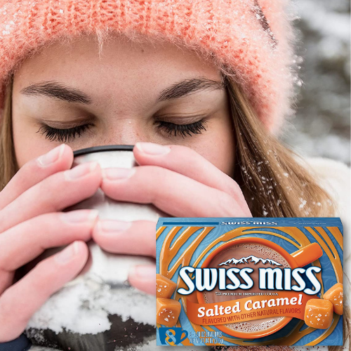 - Includes one 8-count box of Swiss Miss Salted Caramel Flavored Hot Cocoa Mix with 1.38-oz. packets