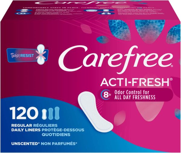 FOUR Boxes 120-Count Carefree Acti-Fresh Regular Panty Liners (Unscented) as low as $4.04 PER BOX After Coupon (Reg. $6.14) + Free Shipping -$0.03/Liner + Buy 4, save 5%