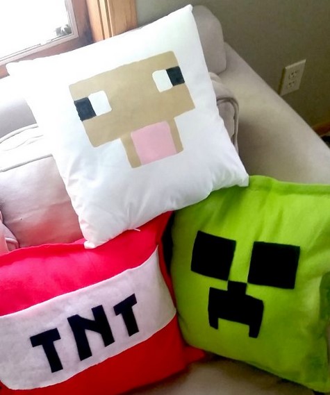 These use fusible glue to put the pillows together, making them washable and not requiring a sewing machine or hot glue. The possibilities are endless thanks to the square shape of everything in the Minecraft universe.