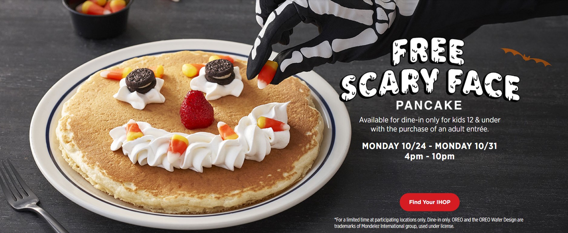 Even better, through October 31, kids 12 and under score a FREE scary face pancake from 4pm- 10pm with the purchase of an adult entrée – no promo code needed.