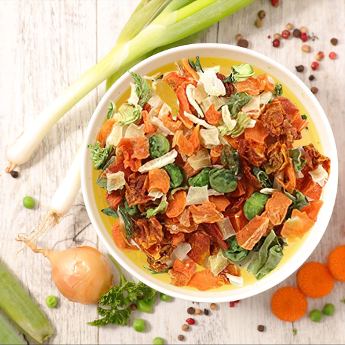 - VEGETABLE SOUP BLEND – It is a flavorful combination of vegetables including onion, carrot, peas, potatoes, bell peppers, green beans, parsley, tomato flakes, and celery flakes. This blend pairs extremely well with soups, stews and prepared dishes that require vegetables.