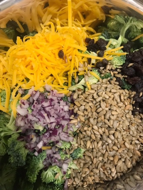 - In a large mixing bowl, mix together the broccoli, cheese, raisins, bacon, sunflower seeds, and onion.